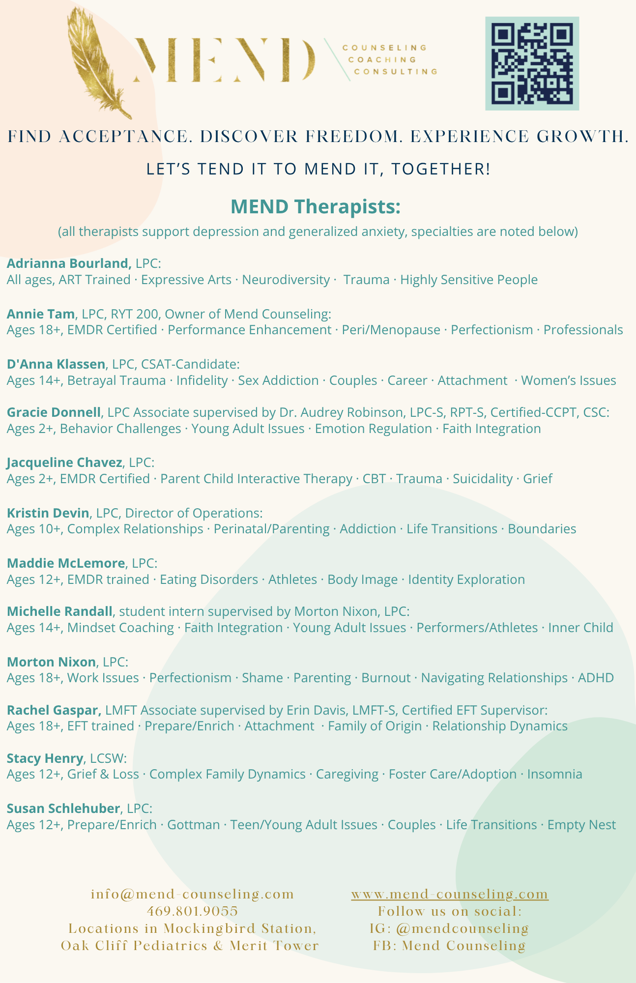 D’Anna offers free 15 minutes consultations to determine your needs and how she can help. You can reach her directly via email, d’anna@mend-counseling.com.