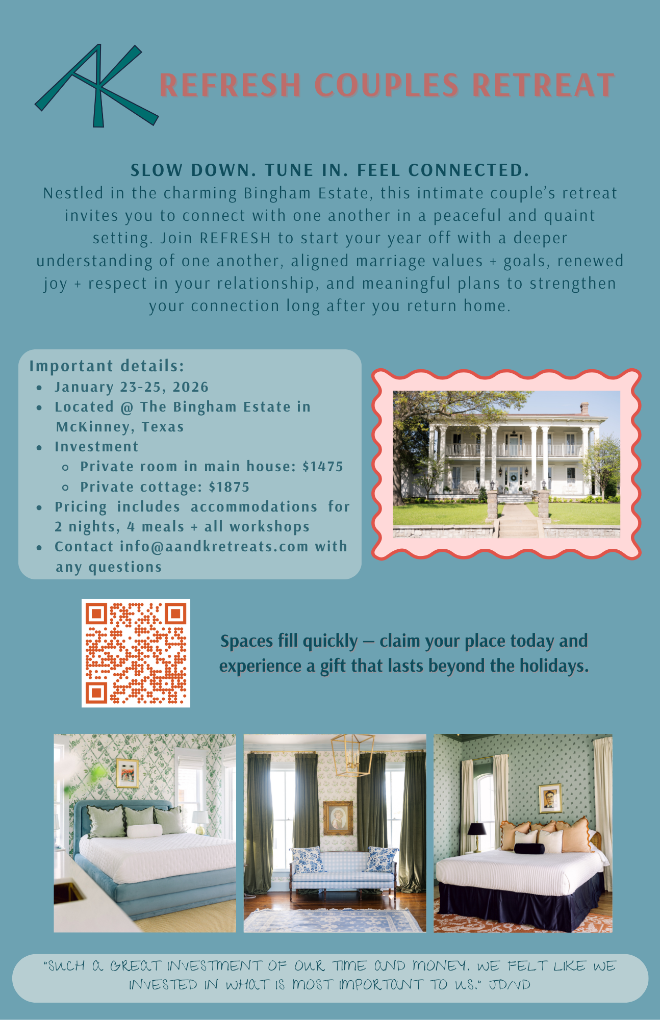She offers coaching and consulting services in addition to counseling. Increasing self awareness and understanding of how her clients relate to others along with goal setting and accountability is at the heart of coaching. Annie is available for presentations and consultations in schools, churches, businesses and groups. She also enjoys consulting with other therapists to help them grow and gain confidence in the amazing work they do each day. In 2020, she cofounded A+K Collective, which provides workshops, 1:1 concierge coaching, “momchic” renewal retreats for the everyday mom, and refreshing couples retreats.