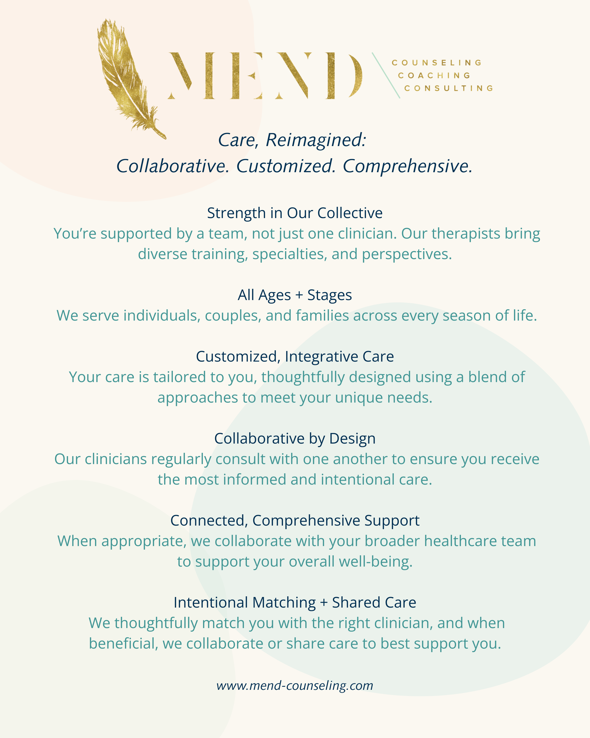 MEND Counseling is an out-of-network provider and does not bill insurance directly. We can provide a detailed statement (superbill) upon request which you may submit to your insurance for possible reimbursement.