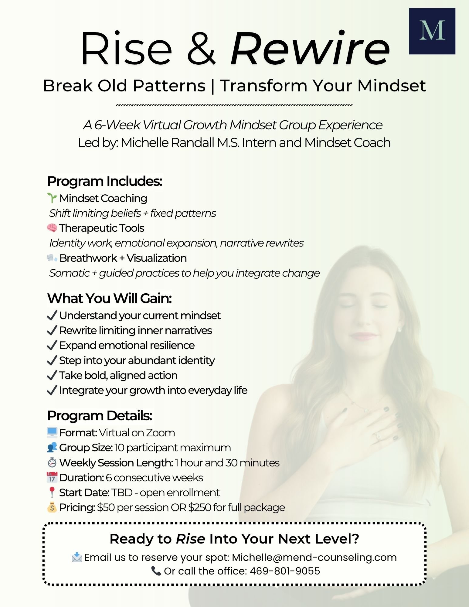 Michelle firmly believes in the philosophy: change your mindset, change your life. She is passionate about empowering clients to recognize their innate capacity for growth and transformation. By addressing negative beliefs often rooted in adverse childhood experiences, Michelle helps clients break free from unhelpful patterns of thinking and feeling that contribute to depression, anxiety, and other challenges. Her goal as a therapist is to cultivate a supportive, accepting, and collaborative environment where clients feel valued and heard. Together, they explore past experiences, identify maladaptive patterns, and create empowering narratives that foster healing and growth.